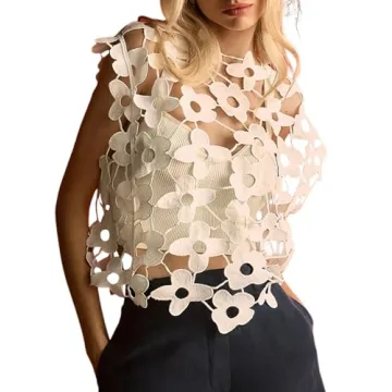 Wyeysyt Women's Hollow Out Floral Lace Vest Sleeveless Crewneck Crochet Cover Up Summer Cropped Going Out Tops (White-L)
