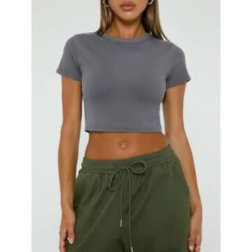 WYNNQUE Womens Crop Tops Cute Summer Scoop Neck Basic Tees Slim Fit Trendy Short Sleeve T Shirts for Teen Girls 2025 Grey S