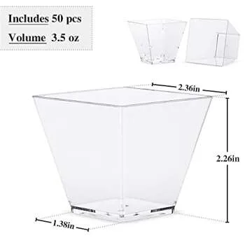 Show moreIntroducing the Xanllaxa 50 Pack 3.5 Oz Plastic Mini Dessert Cups, the perfect solution for serving delightful treats at any occasion! Crafted from premium food-grade crystal clear plastic, these mini dessert cups feature a dimensionally impressive height of 2.26 inches and an upper mouth width of 2.36 inches. Their sleek and stylish cube shape not only elevates the presentation of your gourmet dishes but also allows for the ideal portion-size servings, ensuring that your guests delight in every bite without waste.