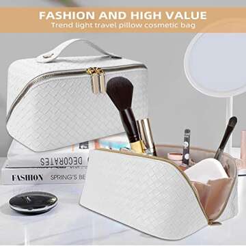 XASRVIR Makeup Bag, Travel Makeup Bag, Leather Waterproof Makeup Bag, Portable flat Large Opening Makeup Bag,Multifunctional Storage Travel Toiletry Bag Skincare Bag(Woven-White)