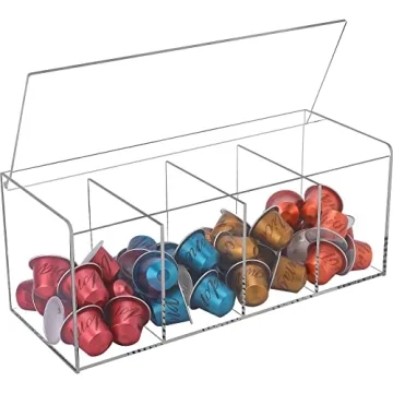 Show moreIntroducing the XBelmber Coffee Pod Holder—a must-have for coffee aficionados that combines modern aesthetics with practical design. Crafted from high-quality clear acrylic, this elegant storage box adds a touch of sophistication to any kitchen or coffee bar setting. Featuring four dedicated compartments, each capable of holding up to 25 original capsules or 5 K Cup pods, it provides an organized solution ideal for all your coffee pod needs. Say goodbye to cluttered countertops and hello to your sleek, efficient coffee station!