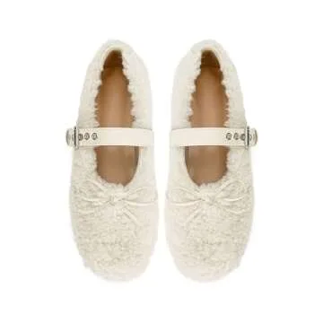 XBKXMK Fur Ballet Flats with Buckle for Women Mary Jane Flats Adjustable Strap Comfy Faux Shearling Flat Ballerina Flat Shoes Causal Daily Dress Shoes White