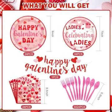 The package includes 1 happy Galentines Day banner, 24 plates (9" and 7"), 24 napkins, and 24 utensils (forks, knives, and spoons).