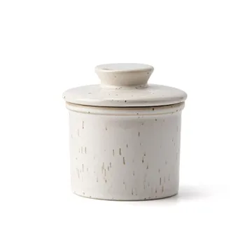 Show more Introducing the XELA Porcelain Butter Keeper Crock, a luxurious addition to your kitchen that transforms the way you enjoy butter. Designed to keep your butter soft and spreadable without refrigeration, this elegant butter keeper ensures that your butter is always ready for your favorite dishes, whether you are spreading it on warm toast or using it in your favorite baking recipe. Crafted with care, this butter crock not only enhances functionality but also adds a touch of sophistication to your countertop. The speckled white finish brings a touch of rustic charm, making it an aesthetic delight for any kitchen.