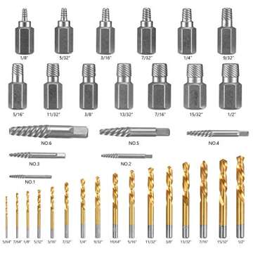 Show moreIf you're tired of stripping screws or struggling with broken bolts, the XEWEA 35-Piece Screw Extractor Set is here to revolutionize your repair experience. This comprehensive toolkit includes an impressive array of tools designed for removing stripped screws, broken studs, and problematic bolts, providing the ultimate solution for DIY enthusiasts and professionals alike. With 13 versatile multi-spline screw extractors, 16 tough left-hand cobalt drill bits, and 6 spiral screw extractors, this set offers everything you need to tackle any challenging fastener job.