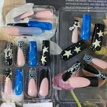 Xiannaipai 24Pcs Square Press-on False Nails, Black, 3D Star Spider Rhinestone Designs, Glossy Finish, Full Cover, 24 Pieces (Pack of 1) for Women and Girls, Ages 12+
