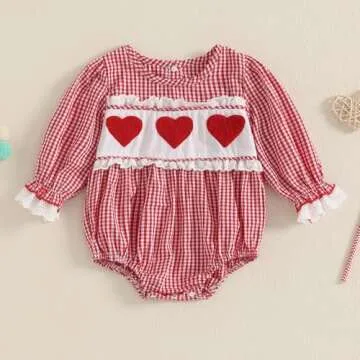 Xiaodriceee Valentine Baby Girl Outfit Heart Embroidery Newborn Long Sleeve Romper Bodysuit Headband Smocked Clothes (Pink, 0-3 Months)