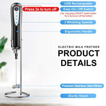 XIMU Milk Frother Handheld, USB Rechargeable 3 Speeds Mini Electric Milk Foam Maker Blender Mixer for Coffee, Latte, Cappuccino, Hot Chocolate, Egg Whisks & Stainless Steel Stand Included