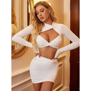 Show moreStep into the spotlight with the XinFSh Women’s 2 Pieces Skirt Long Sleeve Crop Top Cut Out Twist Front Outfits Bodycon Dress designed to make you the center of attention wherever you go. This exquisite outfit features a unique twist design that sets it apart, whether you're rocking the top paired with a chic mini skirt or blending it into a stylish ensemble. The creative twist detail not only adds a visually striking effect but also ensures a fashion-forward flair that elegantly accentuates your curves, giving you a confident edge in any setting.