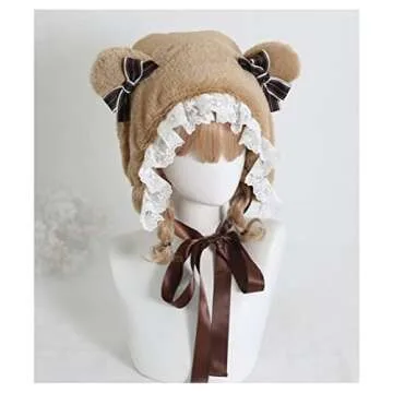 XINGWANG QUEEN Lolita Hat Sweet Plush Bear Ears Lei Feng's Cap Lace Earmuffs Fluffy Warm Winter Cute Headpiece (Brown)