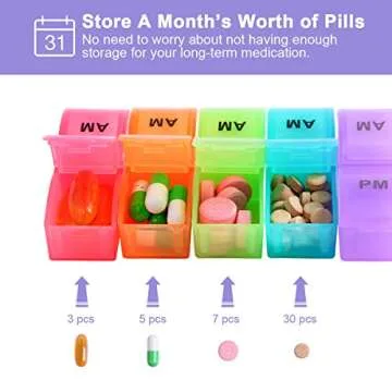 Show more XINHOME Monthly Pill Organizer Box is your trusty companion for managing daily vitamins and medications with unparalleled convenience. This thoughtfully designed 31-day AM/PM daily pill case features a total of 32 compartments for each day, allowing you to keep your meds organized for an entire month. Its unique, bright and translucent design not only provides easy visibility but also enhances your ability to track whether you’ve taken your pills on any given day. Crafted from BPA-free materials, you can be confident that your medications are stored safely, free from harmful chemicals.