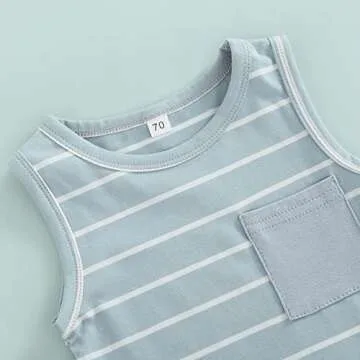 Show more Introducing the xiqaalombvt Baby Boy Summer Clothes Striped Tank Tops Sleeveless T-Shirt and Solid Shorts Outfit, a delightful summer ensemble designed exclusively for your little one. Crafted from high-quality cotton blend fabric, this 2-piece set ensures utmost comfort with its soft and breathable construction, making it perfect for your baby’s sensitive skin. The playful striped sleeveless tank top features a chic pocket, while the solid color drawstring jogger shorts add a trendy touch to this outfit. It’s not just a clothing set; it’s a stylish and functional solution for summer adventures, allowing your baby to move freely and play without any restrictions.