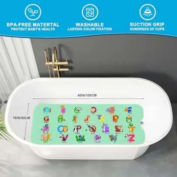 Show more Introducing the **XIYUNTE Baby Bath Mat Non Slip**, a delightful blend of safety and fun designed specifically for your little ones. Measuring a generous **40x16 inches**, this bathtub mat features an engaging cartoon alphabet design that captures kids' imaginations, transforming bath time into an enjoyable adventure. Crafted from soft, **non-toxic, odor-free PVC material**, our mat not only prioritizes your child's comfort but also promotes a safe bathing environment. The combination of a textured surface and **200 strong suction cups** ensures it stays securely in place during every splash and giggle.