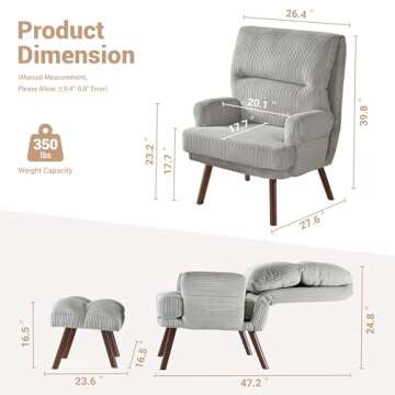 Introducing the **XIZZI Reading Chair with Ottoman**, your new favorite indoor seat that perfectly combines comfort and style! This accent chair set is designed for cozy reading afternoons, movie nights, or simply unwinding after a long day. The chair features overall dimensions of **24.4 inches wide by 27 inches deep and 39.8 inches high**, with a seat height of **17.7 inches**. The padded cushions make relaxation effortless, and with a maximum weight capacity of **350 lbs**, this chair promises durability...