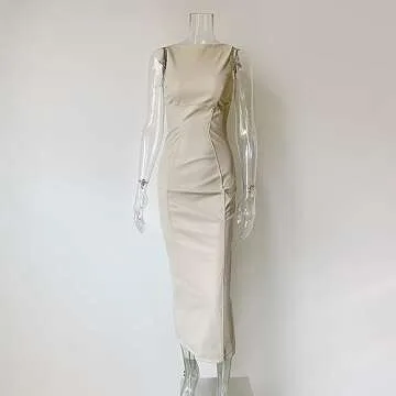 XLLAIS Women's Faux PU Leather Bodycon Maxi Dress Sexy Boatneck Tank Long Dresses (Beige, Medium)