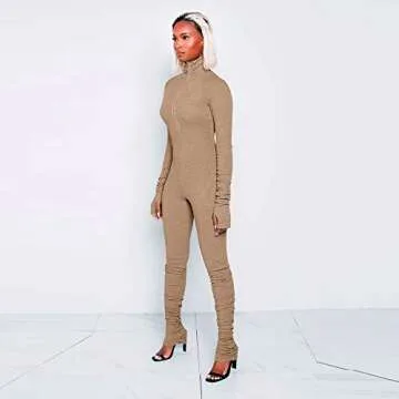 Show moreIntroducing the XLLAIS Women's Long Sleeve High Neck Zipper Bodycon Tight Full Length Jumpsuits - the epitome of stylish comfort and performance! This form-fitting jumpsuit is designed to enhance your figure and make a statement wherever you go. The fashionable ruched ribbed design adds a chic touch, while the front zipper closure and thumb holes bring a contemporary edge, highlighting your natural curves beautifully. Made from high-quality fabric, it guarantees softness and elasticity to ensure a comfortable fit that moves with you, offering both style and functionality.