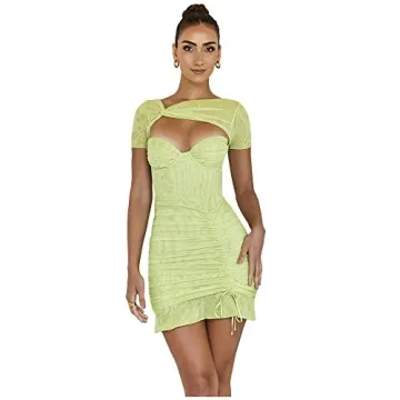 XLLAIS Women's Sexy Stretchy Bodycon Short Sleeve Corset Dress Ruched Mesh Party Club Mini Dresses Green S