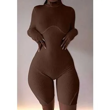 XLLAIS Women Sexy High Neck Long Sleeve Bodycon Shorts Jumpsuit Rib Outfits (Brown, Large)
