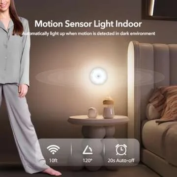 Show more Experience the convenience and innovation of the Motion Sensor Night Light! This versatile puck light redefines nighttime illumination with its dual modes: always on and auto sensing. When set to Auto mode, the light automatically activates upon detecting movement in a dark environment within a range of 120° and 10 feet, ensuring you never fumble in the dark again. After 20 seconds of no movement, it intelligently turns off. Switch to ON mode for situations when you need consistent illumination, perfect for emergencies or extended use.