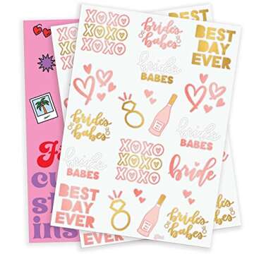 Show more Introducing the xo, Fetti Bride's Babe Tattoos—the ultimate festive decor for your special occasion! These temporary tattoos are not just a decorative addition; they are designed to be a hit among your guests, transforming any bachelorette party, bridal shower, or engagement celebration into a memorable experience. Featuring 34 dazzling designs on two sheets, our tattoos include hand-drawn motifs such as "bride's babe," "xoxo," diamond rings, and playful phrases like "best day ever" and "rose all day". With their chic gold and rose gold metallic finishes, these tattoos will ensure your bridal bash stands out!