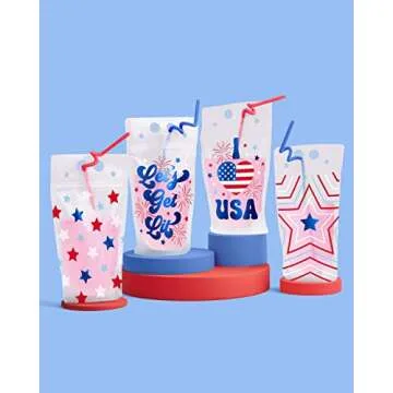 Show moreElevate your Independence Day celebrations with the **xo, Fetti Fourth of July Party Decorations Drink Pouches**! This vibrant 16-pack set features an assortment of brilliantly designed foil drink pouches, complete with an array of red and blue straws. These eye-catching pouches, which come in four unique designs—"Let's Get Lit", "I <3 USA", a striking giant foil star, and a festive foil star pattern—are perfect for both adult and kid-friendly gatherings. Whether you're hosting a backyard BBQ or a grand Olympic celebration, these pouches will undeniably add a patriotic flair to your event.