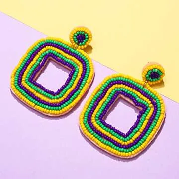 XOCARTIGE Beaded Drop Earrings Multicolored Seed Bead Earrings for Women Bohemia Statement Square Bead Hoop Dangle Earrings for Wedding Party Vacation (Mardi Gras Color)