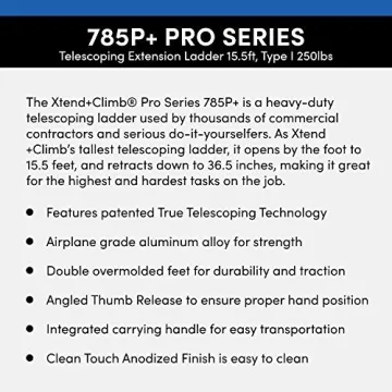 Show moreIntroducing the Xtend & Climb Pro Series 785P+ Telescoping Ladder, the ultimate solution for all your home and outdoor maintenance needs. Crafted with precision and designed for maximum safety, this ladder meets the stringent 2019 ANSI/OSHA standards for compliance, ensuring that you can tackle any job with confidence. Made from Aerospace Engineered airplane-grade aluminum alloy, it combines an impressive strength-to-weight ratio, making it not only incredibly sturdy but also easy to maneuver. Whether you're reaching those high places for painting or cleaning, its telescoping functionality allows you to effortlessly extend and lock the ladder by the foot, adapting perfectly to your needs.