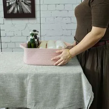 XUANGUO Woven Cotton Rope Storage Basket with Handles for Organizing Shelves Closet Small Cat Dog Pet Toy Basket Box Bin Decorative Rectangle Baby Nursery basket Gift Basket Empty Light pink