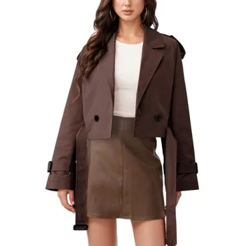 Xuehaya Womens Cropped Trench Coat Long Sleeve Belted Work Office Double Breasted Cropped Jacket(Brown-L)
