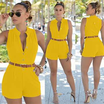 XXTAXN Women's Sexy V Neck Rompers One Piece Short Jumpsuit with Belt And Pockets Yellow