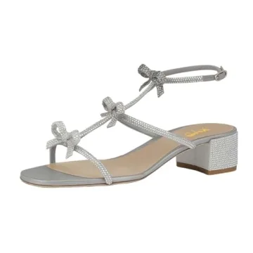 Show more Step into elegance with the XYD Women Gladiator Rhinestone Crystals Block Chunky Heels Open Toe Sandals. These stunning sandals are not just a treat for the eyes but also engineered for comfort. Featuring a 1.6 inches (4 CM) chunky low heel, they blend style with easy wearability. The delicate T-strap design climbs gracefully up your foot and is adorned with shimmering crystals, ensuring all eyes will be on you. The unique crossover strap with dainty bow knots adds a touch of charm, elevating your outfit to new heights.