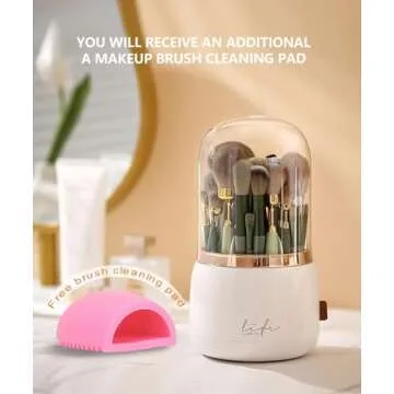 Y.duck Pink Makeup Brush Holder with Lid - 360 Rotating Makeup Organizer for Vanity - Dustproof Make Up Organizers and Storage-With Makeup Brush Cleaner Mat (White)
