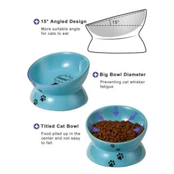 Show more Introducing the Y YHY Elevated Cat Food Bowl, designed specifically for the comfort and health of your cat. This exquisite ceramic bowl combines functionality and style, featuring a tilted design that ensures food remains centered, making it easier for cats to eat without discomfort. By elevating the bowl to an ideal height, it not only aids in reducing the incidence of vomiting but also promotes a more natural neck position during mealtime. The lake blue finish adds a calming touch to your pet's dining setup, seamlessly blending with any home decor.
