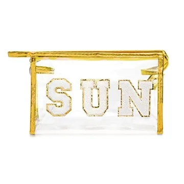 Show moreIntroducing the Y1tvei Gold SUN Preppy Patch Varsity Letter Cosmetic Toiletry Bag, a must-have accessory for every fashionable individual on the go! This chic and modern bag features a vibrant design with a stunning gold frame and a bold "SUN" lettering that pops against its clear PVC surface. Perfect for the beach, pool parties, or travel, this stylish toiletry bag combines functionality with flair, ensuring you can carry your essentials in a trendy way. Measuring approximately 8.8 x 2.7 x 5.5 inches, it’s just the right size to hold makeup, toiletries, and other small essentials without taking up too much space in your luggage or handbag. The high-quality materials guarantee durability and style, making it an ideal companion for your daily adventures.