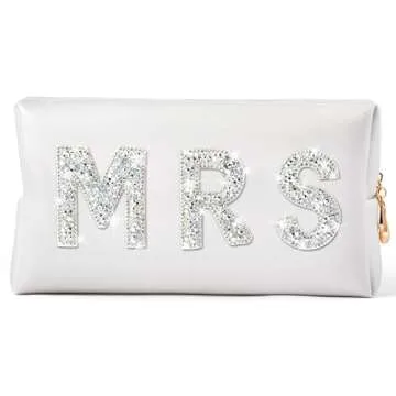 Y1tvei MRS Diamond Rhinestone Patch Letter Cosmetic Bag Sparkle Bride Toiletry Bag White Waterproof Makeup Bag Personalized Gift for Bridal Shower Wedding Bridesmaid Birthday Bachelor Party(X-Large)