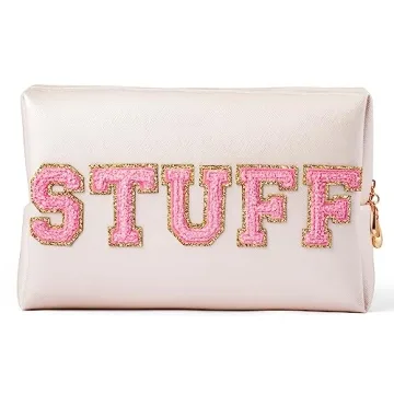 Show moreIntroducing the ultimate blend of fashion and functionality - our Fashion Felt Patch Cosmetic Bag. This chic accessory is designed with a magnificent shell gold color and is adorned with bold pink felt letter patches spelling ‘STUFF’, elegantly trimmed in gold. This stylish yet minimalist design makes it a must-have for anyone looking to add a touch of elegance to their ensemble. Its spacious interior of approx. 9.8*2.7*5.1 inches is specifically crafted, providing you ample room to organize your daily essentials, whether it's high-frequency items like lipsticks, hand creams, sunscreens, or even your phone and keys. With a focus on practicality, this makeup bag is perfect for both daily use and travel needs.