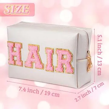 Show more Introducing the ultimate blend of style and functionality - our premium Fashion Felt Patch Design Cosmetic Bag. This chic bag features a radiant shell gold color adorned with playful ‘HAIR’ pink felt letter patches, elegantly trimmed with gold accents. Its minimalist design sets the stage for a fashionable statement, encapsulating vitality and elegance for every on-the-go beautician. Crafted from high-quality PU leather, it stands resilient against spills and mess, ensuring that your essentials are protected and always look neat and tidy.