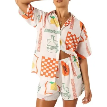 Show moreDiscover the ultimate style statement with the Y2K 2 Piece Printed Shorts Set for Women. This eye-catching outfit is designed to turn heads with its vibrant colors and charming prints, perfectly embodying the fun, carefree spirit of summer. Made from a high-quality blend of 49% viscose, 28% polyester, and 23% nylon, this set is not only soft and breathable but also incredibly cozy, making it an ideal choice for any casual outing. The button-down shirt elegantly paired with high-waisted shorts offers both comfort and style, making this ensemble a must-have addition to your wardrobe.