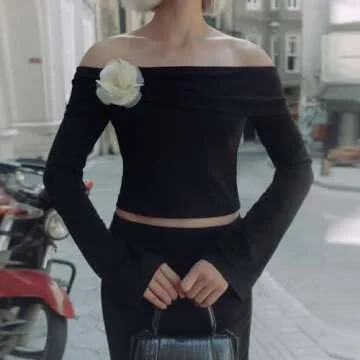 Y2k Off Shoulder Top for Women 3D Flower Pattern Slim Fit Long Sleeve Shirt Elegant Boat Neck Going Out Top Streetwear