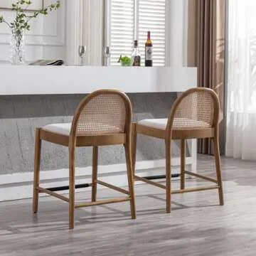 Ya-Home Mid-Century Bar Stools Set of 4, 26 Inch Rattan Back Linen Counter Height Barstools Comfy Upholstered Bar Chairs with Wooden Legs for Kitchen Dining Room, Beige