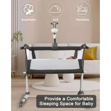 Show moreThe Yacul Baby Bassinet is the perfect companion for new parents, seamlessly blending comfort and functionality in an elegant dark gray design. This bedside crib features a built-in music box that plays 8 soothing melodies tailored for newborns, creating a calm environment that helps entertain and lull your baby to sleep. Whether you're navigating late-night feeds or just want peace of mind while your little one sleeps, this bassinet has you covered. Easily transition from room to room thanks to the 4 smooth-rolling casters with locks, allowing you to keep your baby close without the hassle of heavy lifting. What’s more, with its height adjustable capability boasting 6 different positions, parents can snugly fit the bassinet next to their bed or even on a couch, ensuring your infant is always within arm’s reach. Made from BPA-free materials, the bassinet includes a waterproof mattress with a soft, washable cover that assures your baby's skin remains protected while they drift off to dreamland. Less