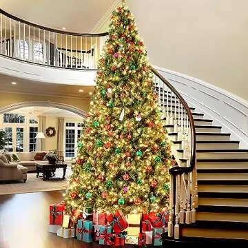 Show more This stunning 12ft Artificial Christmas Tree redefines holiday elegance with its magnificent design and exceptional quality. Crafted by a renowned brand known for premium decorations, this tree impresses not just in height but also in its appearance and durability. The branches and tips are made from high-quality PVC, ensuring safety and longevity, while the iron trunk and stand provide a stable base for all your festive decorations. Whether placed inside your home or in your garden, the tree radiates warmth with its 1500 pre-installed clear warm lights. Forget about the hassle of hanging lights—this tree has it all elegantly integrated.