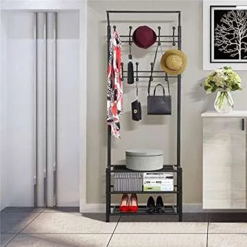 Crafted from sturdy metal, our entryway coat rack boasts a powder-coated finish that ensures excellent water and rust resistance. This durability means that it will stand up to the rigors of daily use, providing you with a long-lasting storage solution that you can rely on.