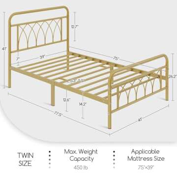Show moreExperience a perfect blend of style and functionality with the Yaheetech Twin Bed Frame Metal Platform Bed. This unique bed frame offers an eye-catching vintage industrial sensibility, highlighted by an extra-high headboard and charming petal accents on both the headboard and the footboard. Designed for cozy evenings, this frame provides the perfect backdrop for snuggling up with a good book or browsing the web in comfort. The antique gold finish adds a touch of elegance, bringing character to any bedroom décor.