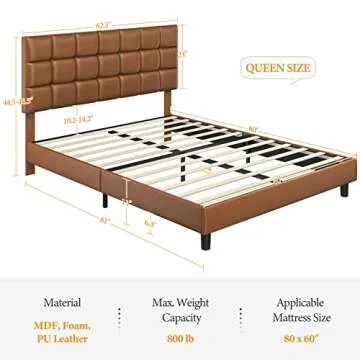 Show moreExperience the perfect blend of style and stability with the Yaheetech Upholstered Platform Bed Frame. This elegant queen-size bed frame is designed with your comfort in mind, featuring a sleek faux leather headboard that not only enhances your bedroom decor but also offers a cushioned space for resting your head. Constructed from a sturdy metal frame and supported by 8 strong legs along with 12 solid wood slats, this platform bed ensures exceptional stability and can support up to a remarkable 363 kg (800 lb) weight capacity. With added EVA foam on the metal frame, say goodbye to squeaky and shaky beds—this frame guarantees a noise-free sleeping experience.