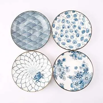 YALONG Ceramic Japanese Dinner Plates Set 7 Inch Appetizer Shallow Plates Serving Lunches, Cheese Salad, Dessert Set of 4 Assorted Motifs Microwave & Dishwasher Safe