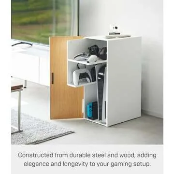 Show moreIntroducing the Yamazaki Home Tower Large Capacity Game Console Rack, the perfect solution for organizing your game consoles and accessories without sacrificing style. This elegant storage rack measures 14.37 x 9.72 x 23.74 inches and weighs in at a sturdy 22.05 pounds. Crafted from high-quality steel with a sleek powder coating and complemented by beautiful natural wood laminated plywood doors, this console rack combines functionality with modern aesthetics. Its space-saving design, inspired by Japanese “small-space living,” ensures that your living room or study remains tidy and sophisticated.