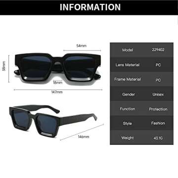 Step into the world of retro fashion with these stylish square sunglasses, designed to make a statement wherever you go. With their thick frame, these sunglasses not only showcase your uniqueness but also enhance your overall style. Whether you're out for a leisurely drive, soaking up the sun at the beach, or simply enjoying a casual stroll, these retro-inspired shades are the perfect accessory for both men and women. Made with high-quality materials, the UV400 lenses provide 100% eye protection...