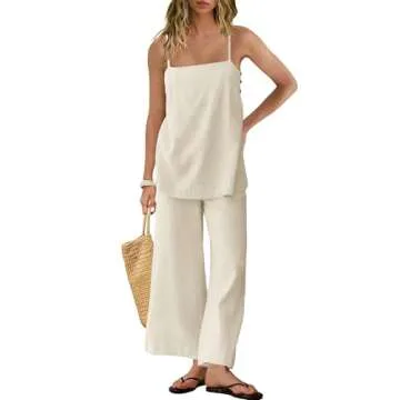 Show more Introducing the Yanekop Linen Sets for Women – the ultimate combination of comfort and style for your summer outings! Crafted from a soft, breathable linen fabric, this two-piece pajama set ensures an exquisite wearing experience, perfect for any casual occasion. Its chic and timeless design features an off spaghetti strap cami top paired with wide-leg pants, making it a must-have addition to your summer wardrobe. Whether you're hosting a cozy gathering or taking a stroll under the sun, this outfit keeps you looking effortlessly elegant.