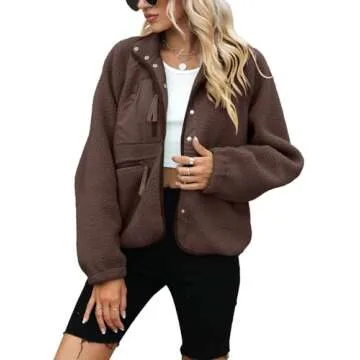 Yanekop Womens Fleece Jacket Fuzzy Long Sleeve Short Coats Button Down Sherpa Outerwear with Pockets(A Dark Brown,L)
